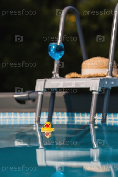 Летний сезон, концепция детской игры. Маленькая резиновая желтая утка плавает в воде в бассейне. Игрушка крупным планом. Символ плавания, детства, дружбы, веселой игры