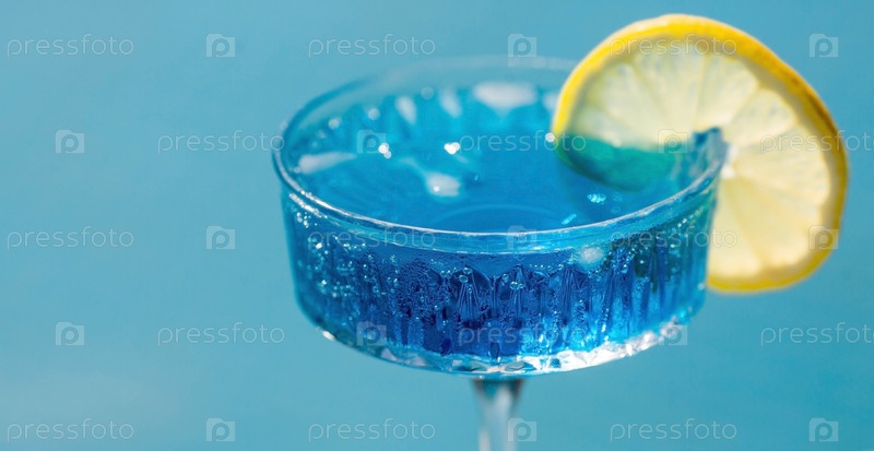 Стакан вкусного голубого коктейля Голубая лагуна и желтые лимоны на фоне бассейна. Алкогольный коктейль из сочных фруктов блю с ликером кюрасао, кубиками льда и долькой лимона