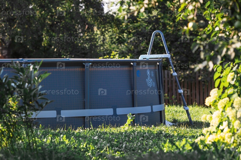Бассейн с металлическим каркасом для дома и сада. Каркасный бассейн во дворе. Солнечная баня.Установка бассейна. Концепция летнего отдыха и отдыха