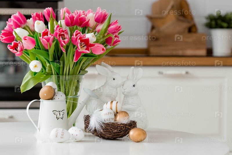 Букет тюльпанов, пасхальные кролики и яйца с золотым узором на столе. На заднем плане белая кухня в скандинавском стиле. Красивая открытка. Минимальная концепция