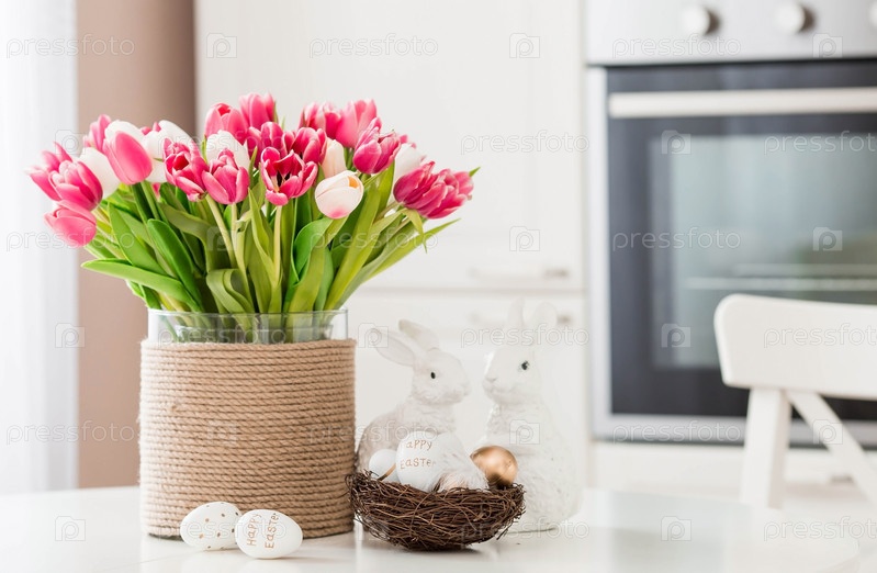 Букет тюльпанов, пасхальные кролики и яйца с золотым узором на столе. На заднем плане белая кухня в скандинавском стиле. Красивая открытка. Минимальная концепция