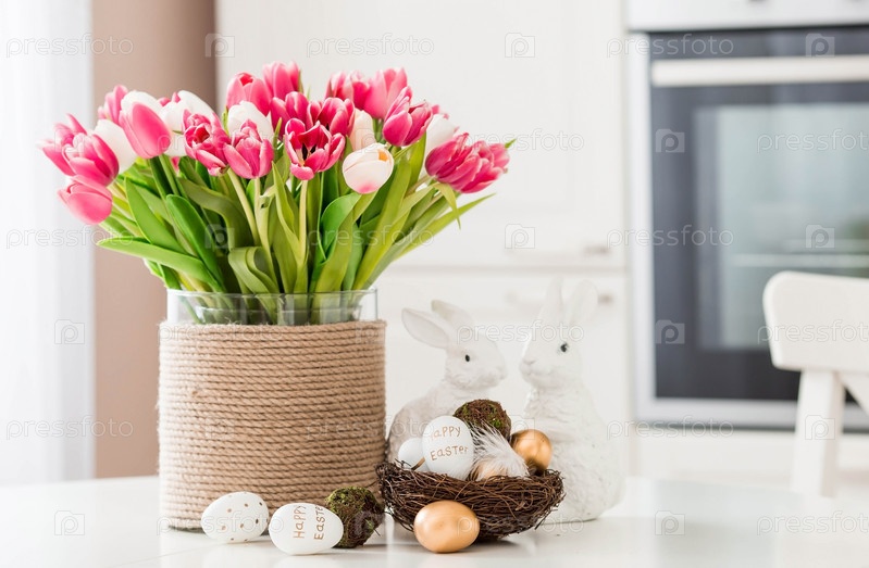 Букет тюльпанов, пасхальные кролики и яйца с золотым узором на столе. На заднем плане белая кухня в скандинавском стиле. Красивая открытка. Минимальная концепция