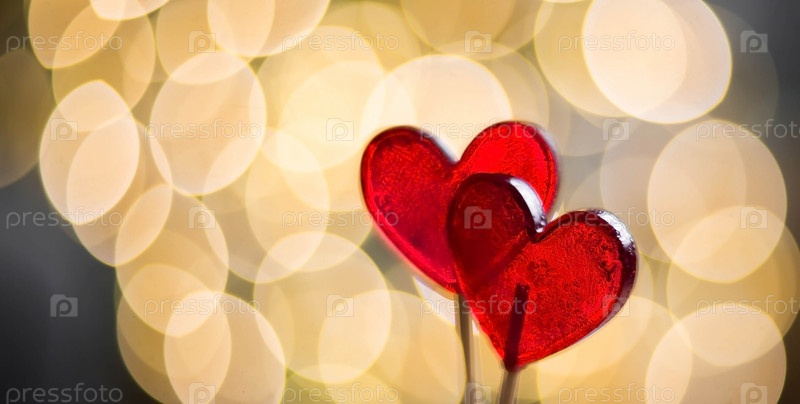 Два леденца в форме красных сердец. Конфеты на палочке на фоне красивого боке. Концепция любви и День святого Валентина