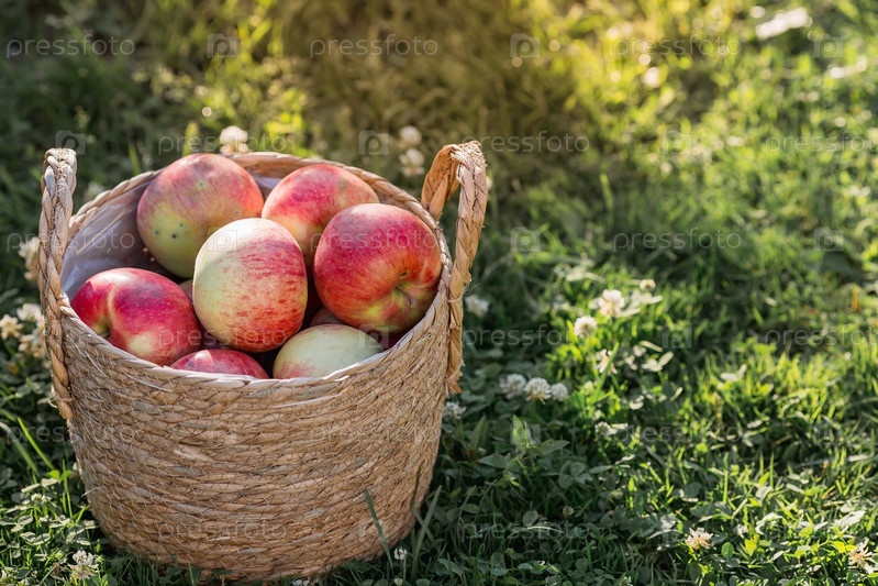 Плетеная корзина со свежими фруктами. Корзина с красными яблоками на зеленой лужайке. Красивый солнечный свет. Осенний урожай, сбор урожая или сбор урожая