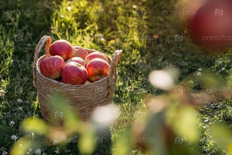 Плетеная корзина со свежими фруктами. Корзина с красными яблоками на зеленой лужайке. Красивый солнечный свет. Осенний урожай, сбор урожая или сбор урожая