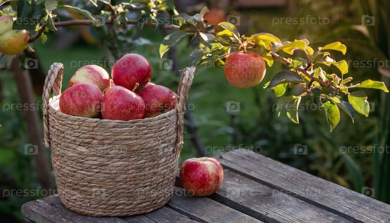 Плетеная корзина со свежими фруктами. Корзина с красными яблоками. Красивый солнечный свет. Осенний урожай, сбор урожая или сбор урожая