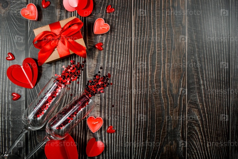 Два стакана конфетти, красные сердца, подарочная коробка и свечи на деревянном фоне с копией пространства. Концепция праздника всех влюбленных. Открытка на день святого валентина
