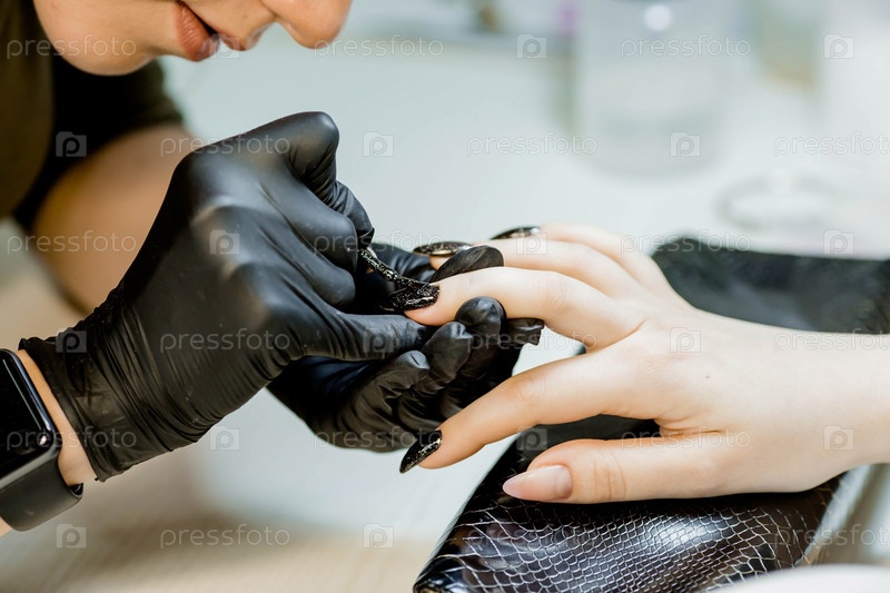 Мастер маникюра в салоне красоты выполняет процедуру окрашивания ногтей клиента. Женская мода и красота. Самообслуживание