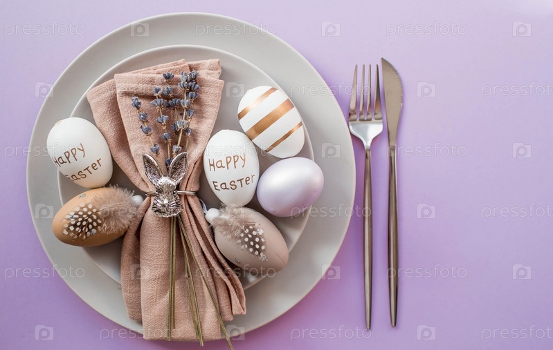 Концепция счастливого, светлого праздника Пасхи. Сервировка стола. Тарелка с кроликом на салфетке, лавандой и пасхальными яйцами на модном фоне 2022 года — это очень красиво. Вид сверху
