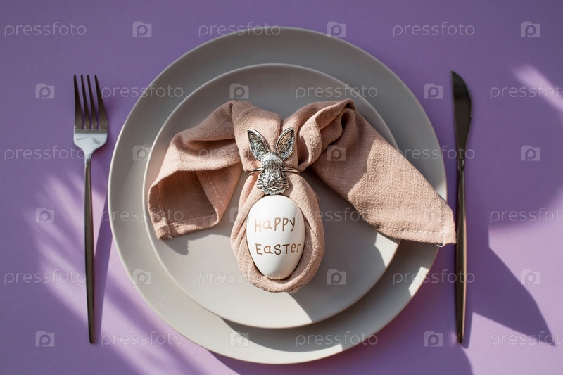 Концепция счастливого, светлого праздника Пасхи. Сервировка стола. Тарелка с кроликом на салфетке, лавандой и пасхальными яйцами на модном фоне 2022 года — это очень красиво. Вид сверху