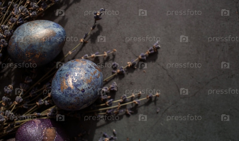 Пасхальная открытка с копией места для текста. Фиолетовые, синие и золотые яйца с лавандой на темном фоне. Тенденция фиолетового оттенка 2022 года очень актуальна. Чай каркаде с натуральным красителем. Вид сверху