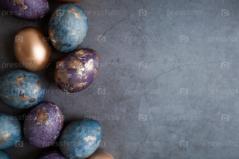 Пасхальная открытка с копией места для текста. Фиолетовые, синие и золотые яйца на темном фоне. Тенденция 2022 года – фиолетовый оттенок очень пери. Чай каркаде с натуральным красителем. Вид сверху