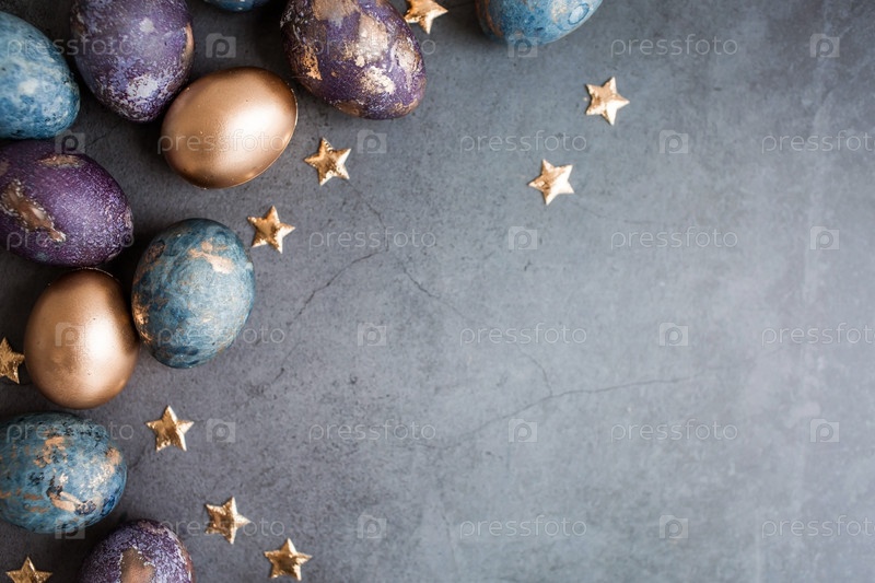 Фиолетовые, синие и золотые яйца на темном бетонном фоне. Тенденция фиолетового оттенка 2022 года очень опасна. Пасхальная открытка с копией места для текста. Чай каркаде с натуральным красителем. Вид сверху