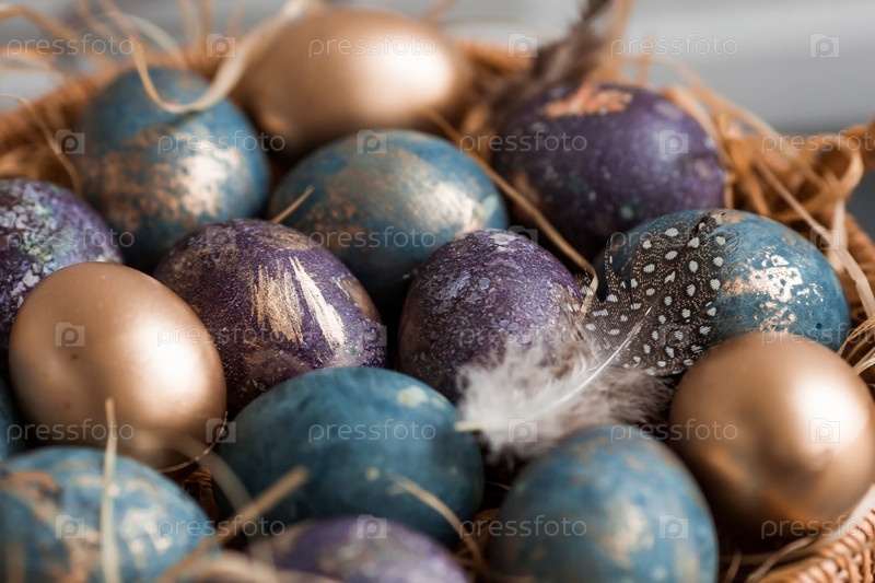 Пасхальная открытка с копией места для текста. Фиолетовые, синие и золотые яйца на темном фоне. Тенденция 2022 года – фиолетовый оттенок очень пери. Чай каркаде с натуральным красителем. Вид сверху