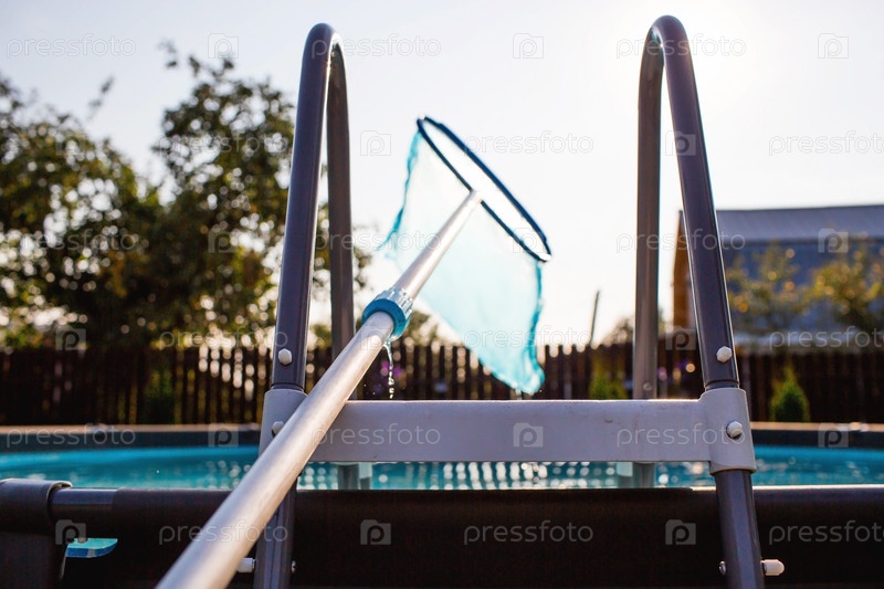 Абстрактное размытие и расфокусированный фон. Очистка бассейна с металлическим каркасом с сеткой от грязи. Очиститель бассейнов во время работы. Солнечное знамя. Концепция летнего отдыха