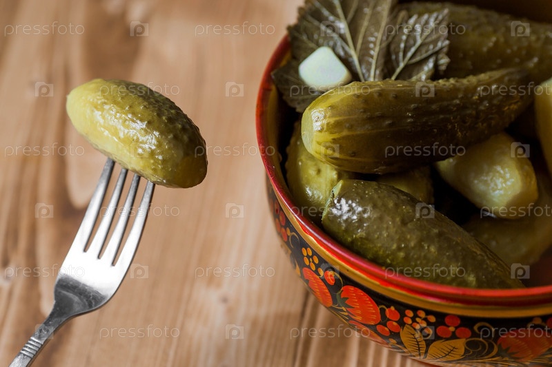 Хрустящие огурцы в русской деревянной миске на деревянном столе. Целые зеленые маленькие огурчики с укропом и чесноком. Вкусные консервированные овощи. Закрываем огурцы на зиму