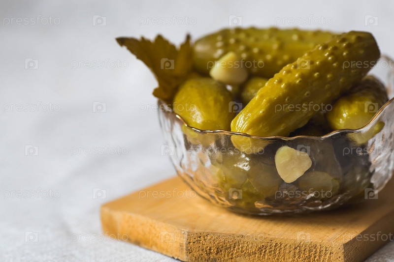 Хрустящие соленья в прозрачной стеклянной посуде на столе с льняной скатертью. Целые зеленые маленькие огурчики с укропом и чесноком. Вкусные консервированные овощи. Закрываем огурцы на зиму