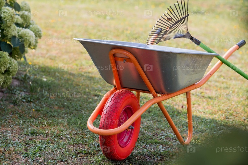 Садовая тачка и грабли на заднем дворе дома. Концепция работы по дому, садоводства и загородной жизни. Подготовка сада к осени и зиме. Закрытие летнего сезона