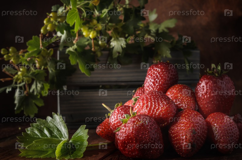 Ягоды спелой клубники на темном деревянном фоне в деревенском стиле