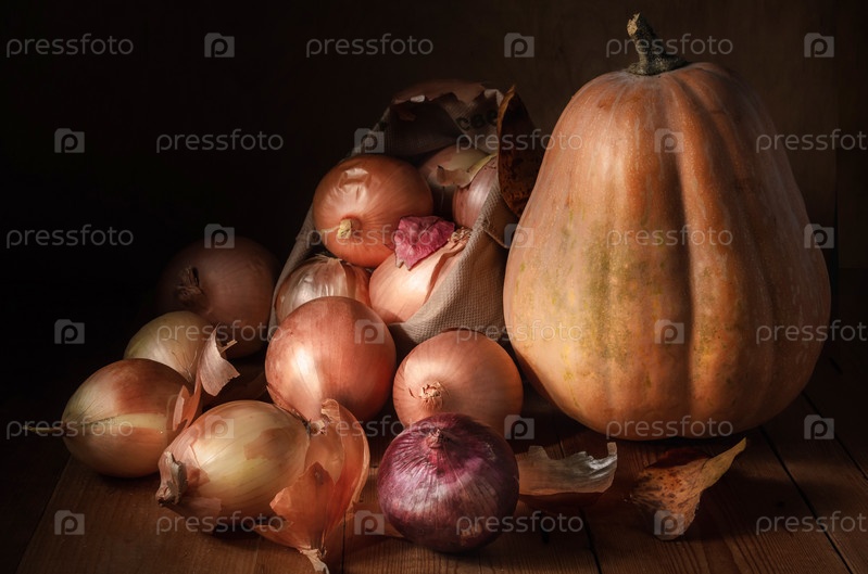 Лук в тканевом мешочке и тыква