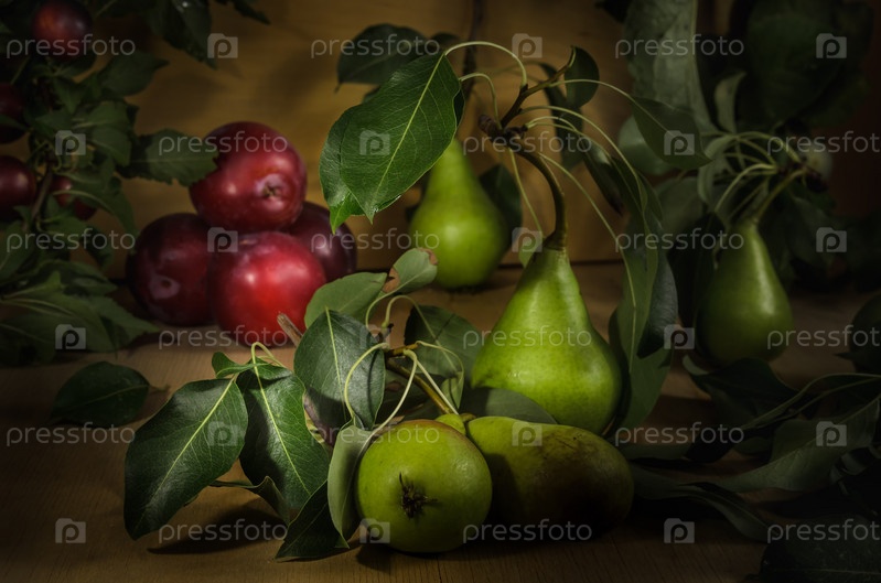 Спелые сочные груши на темном деревянном фоне оптом
