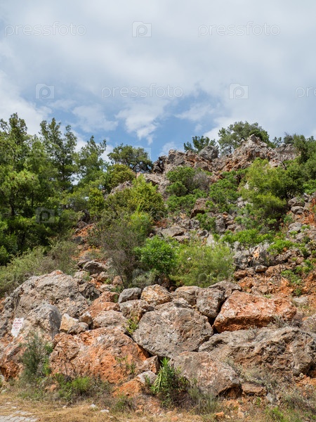 Скалы и деревья на горных склонах каньона Гейнюк в прибрежном национальном парке Бейдаглари. Турция