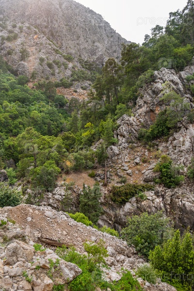Туристическая тропа вдоль реки в каньоне Гейнюк. Вид с воздуха на горные склоны в прибрежном национальном парке Бейдаглари. Турция
