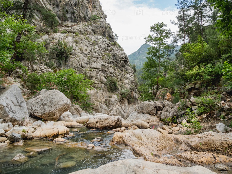 Деревья и камни в реке в каньоне Гейнюк. Горные склоны в прибрежном национальном парке Бейдаглари. Турция