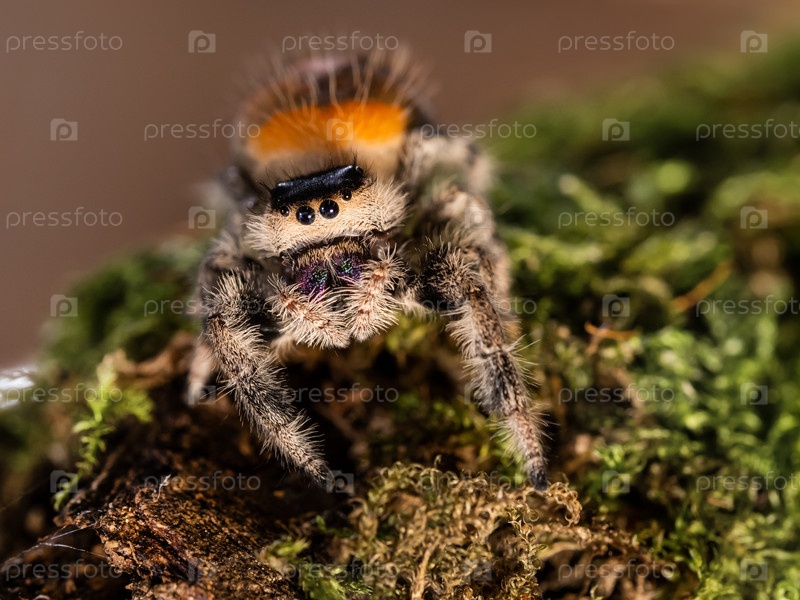 Крупным планом портрет паука тарантула. Большая волосатая паукообразная на зеленом мху