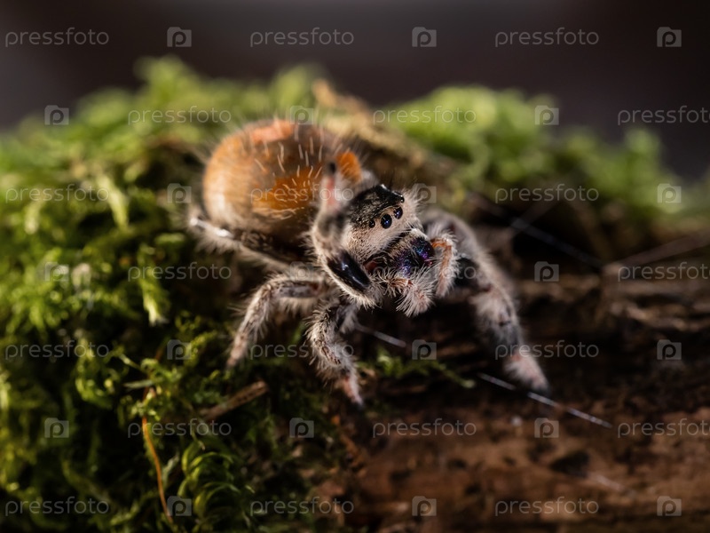 Крупным планом портрет паука тарантула. Большая волосатая паукообразная на зеленом мху