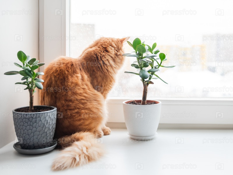 Любопытный рыжий кот сидит на подоконнике с двумя суккулентами, а снаружи падает снег. Комфорт дома с пушистыми домашними животными и комнатными растениями в холодное время года