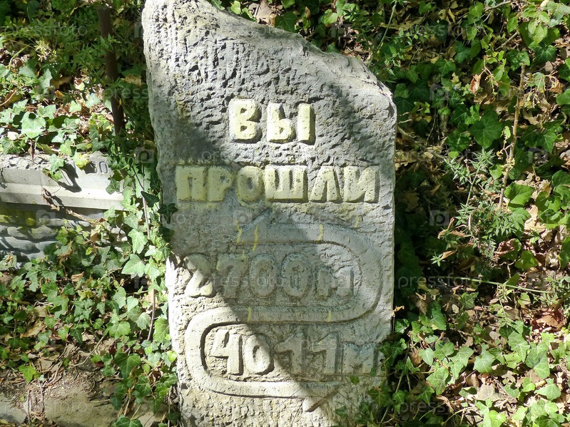 Гранитный камень, указывает пройденное расстояние по Солнечной (Царской) тропе в обе стороны, высоту над уровнем моря. Длина в одну сторону 6711 метров