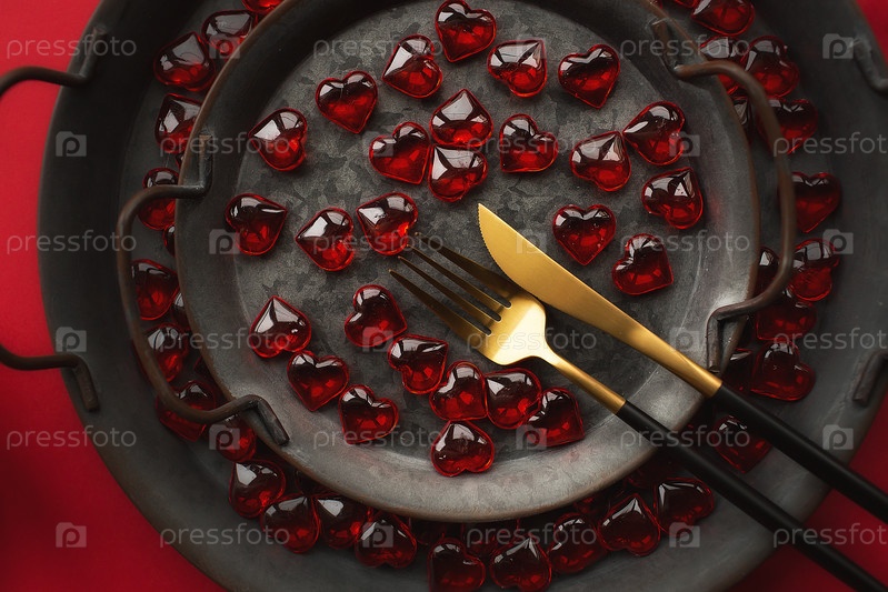 Баннер. Сервировка праздничного стола. Сердце на вилке крупным планом. Концепция праздника. День Святого Валентина. Скопируйте место для надписей