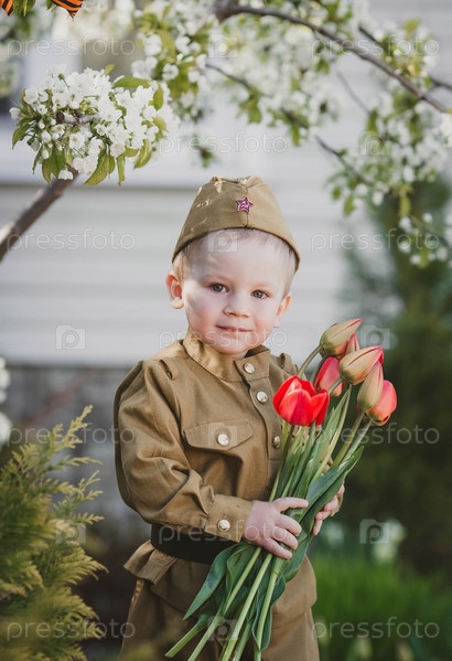9 мая. Маленький мальчик 2 лет в военной форме с букетом красных тюльпанов на фоне цветущей сакуры. Концепция Дня Великой Победы 1941-1945 гг. и Дня защитника Отечества