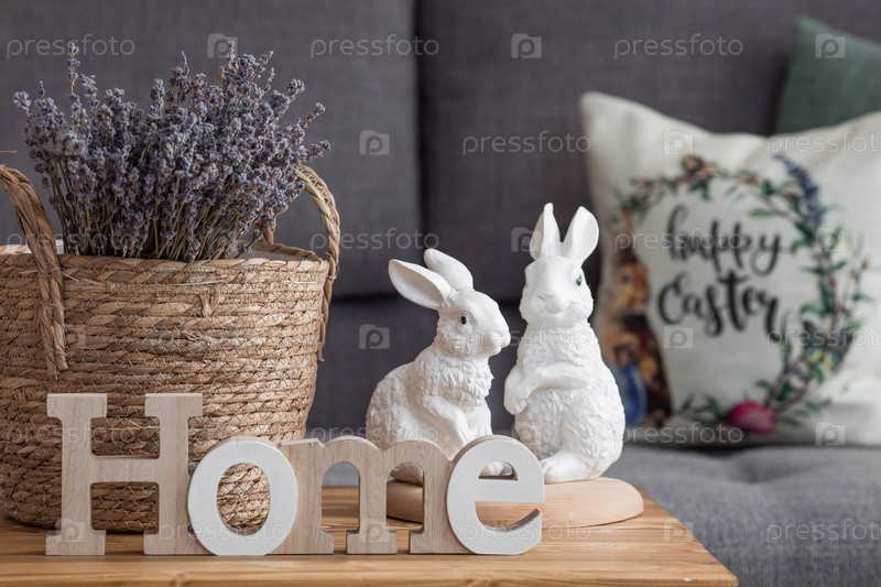 Красивая открытка. Плетеная корзина с пасхальными яйцами, лавандой и кроликами крупным планом. Прованс. Концепция светлого праздника Пасхи 2023