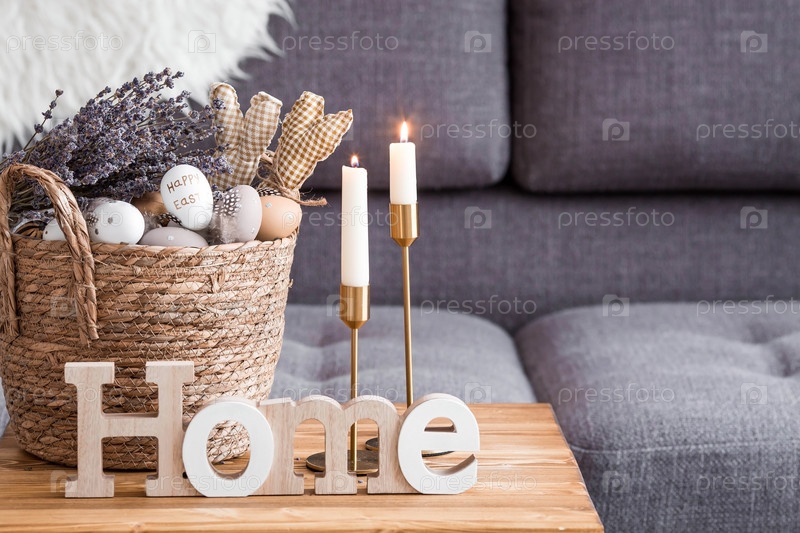 Красивая открытка. Плетеная корзина с пасхальными яйцами, лавандой и кроликами крупным планом. Прованс. Концепция светлого праздника Пасхи 2023