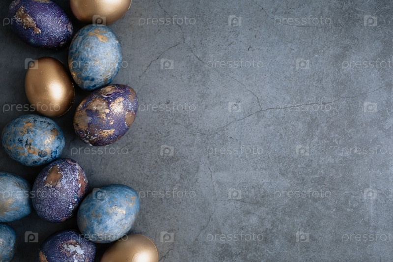 Пасхальная открытка с копией места для текста. Фиолетовые, синие и золотые яйца на темном фоне. Тенденция 2022 года – фиолетовый оттенок очень пери. Чай каркаде с натуральным красителем. Вид сверху