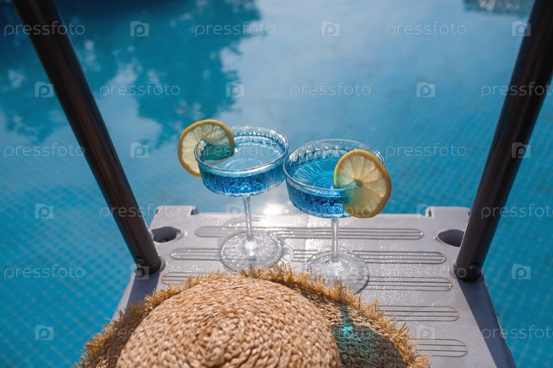 Стакан вкусного голубого коктейля Голубая лагуна и желтые лимоны на фоне бассейна. Алкогольный коктейль из сочных фруктов блю с ликером кюрасао, кубиками льда и долькой лимона
