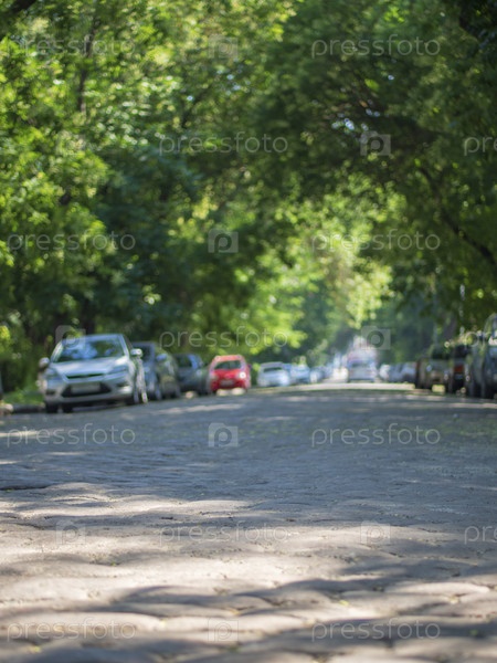 Улица курортного города. Переулок в большом городе, по улице едут машины. Вид с уровня дороги. Автомобили, припаркованные у дороги в летний день в парке
