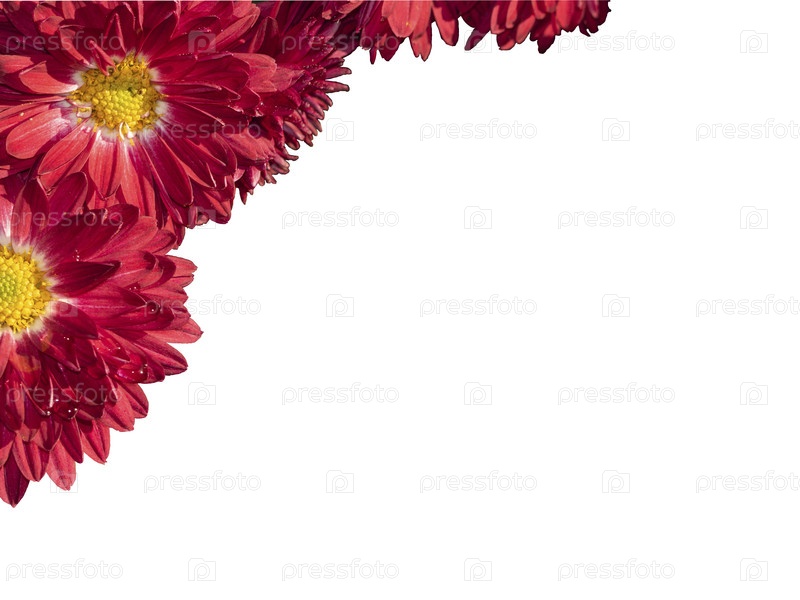 Букет красных хризантем, изолированные на белом фоне. Изолированная цветочная рамка для поздравительных открыток на День святого Валентина, Международный женский день, День матери, День рождения