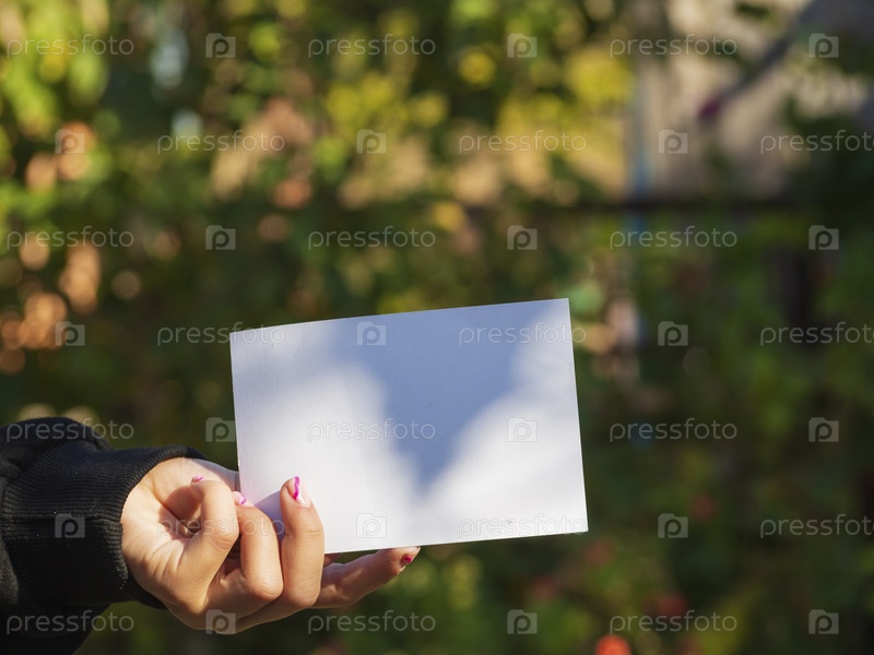 Скопируйте пространство белой бумаги на фоне природы. Используйте его, чтобы разместить текст на пустом месте. Девушка держит в руках чистый белый картон на фоне размытого зеленого сада