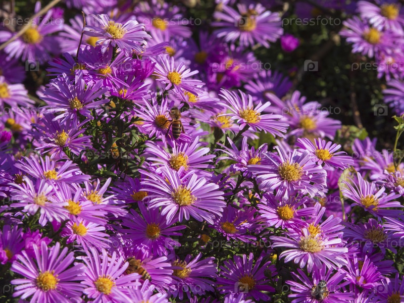 Цветущий куст астры в лучах заходящего солнца. Медоносная пчела опыляет лилово-розовые цветы астры осеннего сада. Цветочный фон. Осенью цветут пурпурные рождественские ромашки