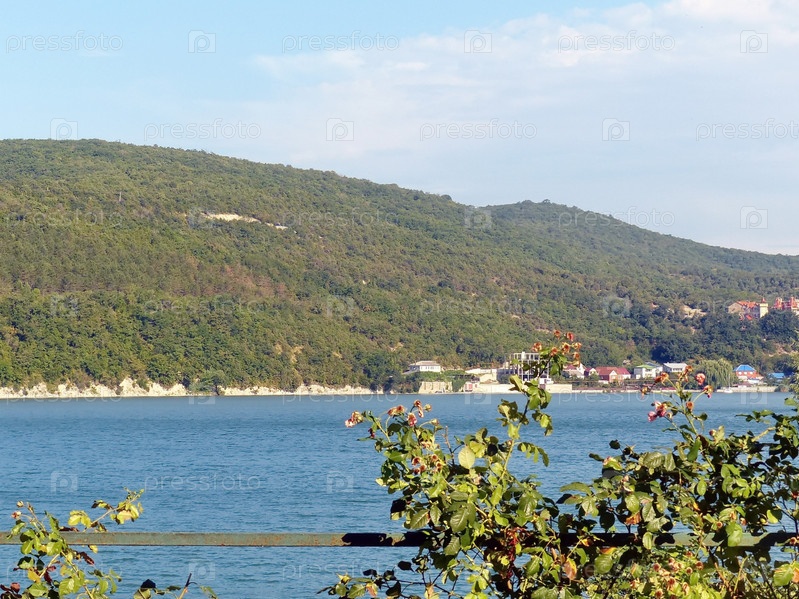 Горы, покрытые лесом, на фоне голубого озера Абрау. Абрау-Дюрсо, Россия