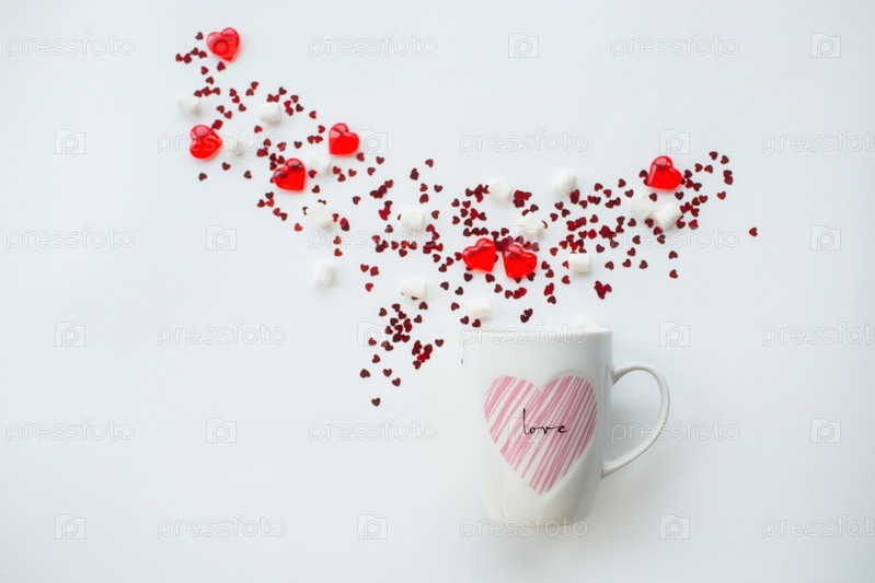 Кружка с зефиром и красными сердцами на белом фоне. Плоская композиция. Романтическая концепция дня святого Валентина