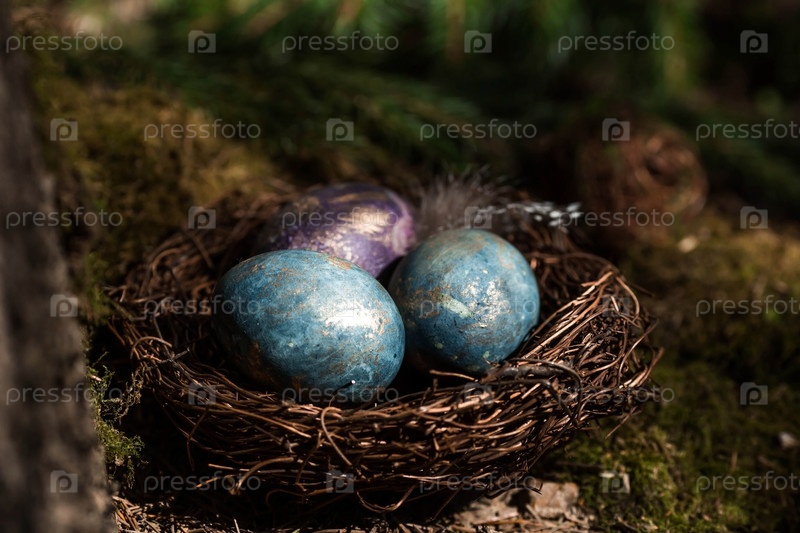 С Пасхой 2023. Открытка с копией места для текста. Фиолетовые, синие и золотые яйца в гнезде на фоне естественного леса. Вид сверху