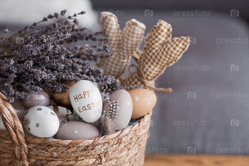 Красивая открытка. Плетеная корзина с пасхальными яйцами, лавандой и кроликами крупным планом. Прованс. Концепция светлого праздника Пасхи 2023