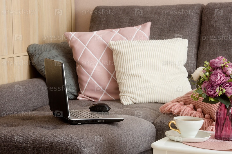 Работайте удаленно из дома. Компьютер на сером диване. Оставайтесь в безопасности дома. Дистанционное обучение, образование и работа. Заказать еду онлайн