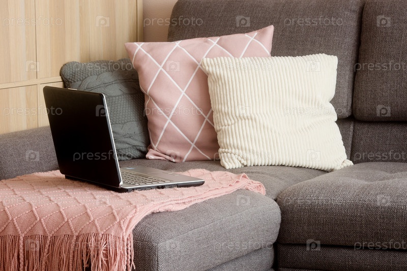 Работайте удаленно из дома. Компьютер на сером диване. Оставайтесь в безопасности дома. Дистанционное обучение, образование и работа. Заказать еду онлайн