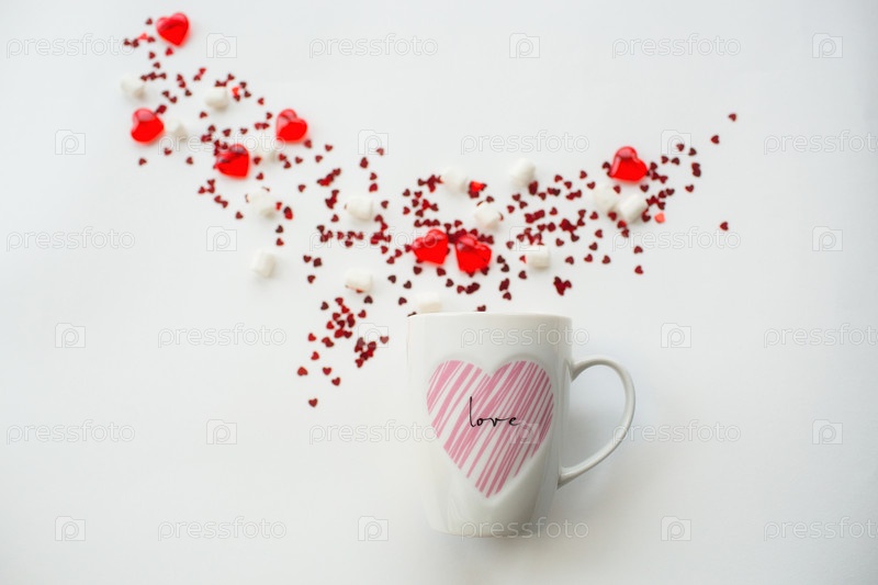 Кружка с зефиром и красными сердцами на белом фоне. Плоская композиция. Романтическая концепция дня святого Валентина