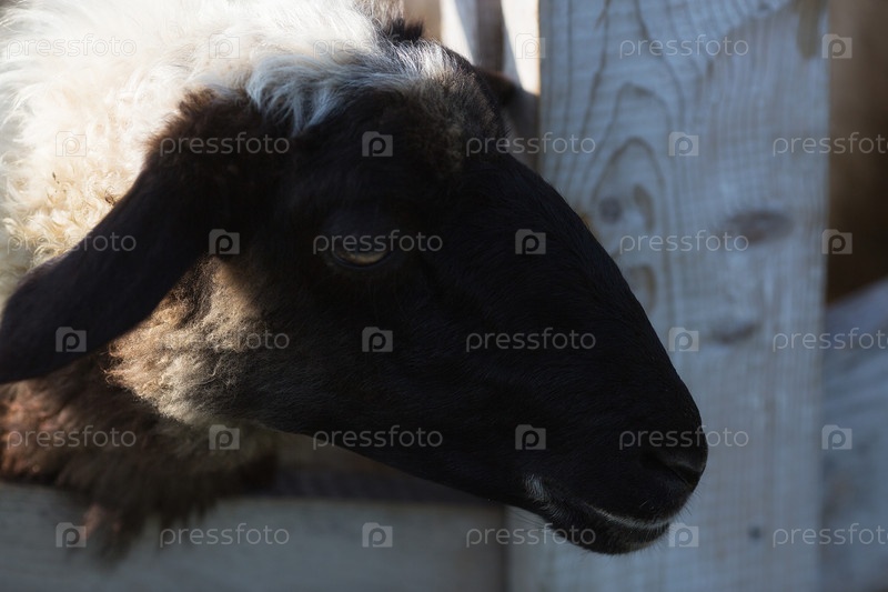 Скот. Овца в загоне. Концепция животноводства и сельской жизни. Портрет овец на свежем воздухе. Крупный план. Домашнее животное на частной эко ферме. Сельскохозяйственная промышленность